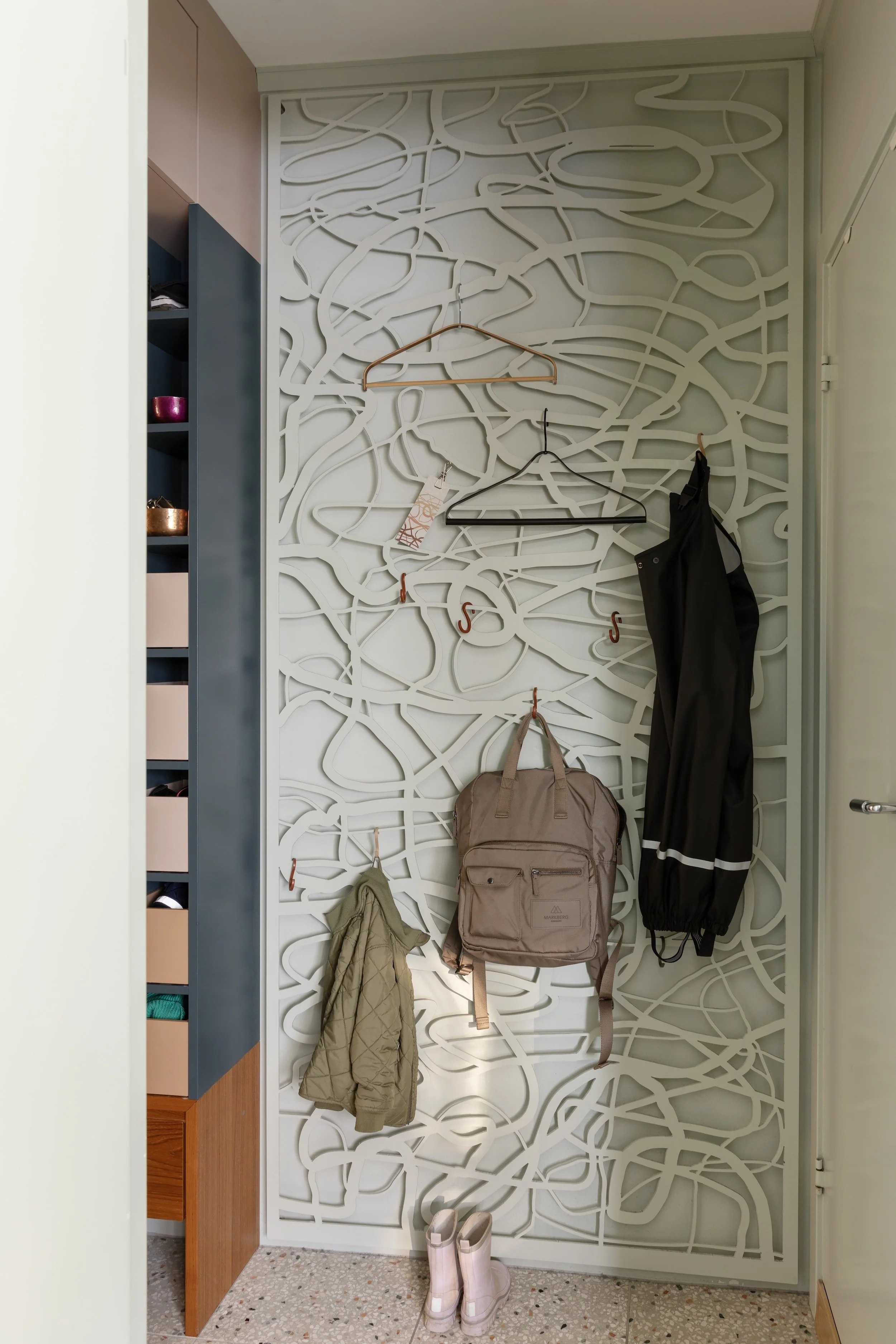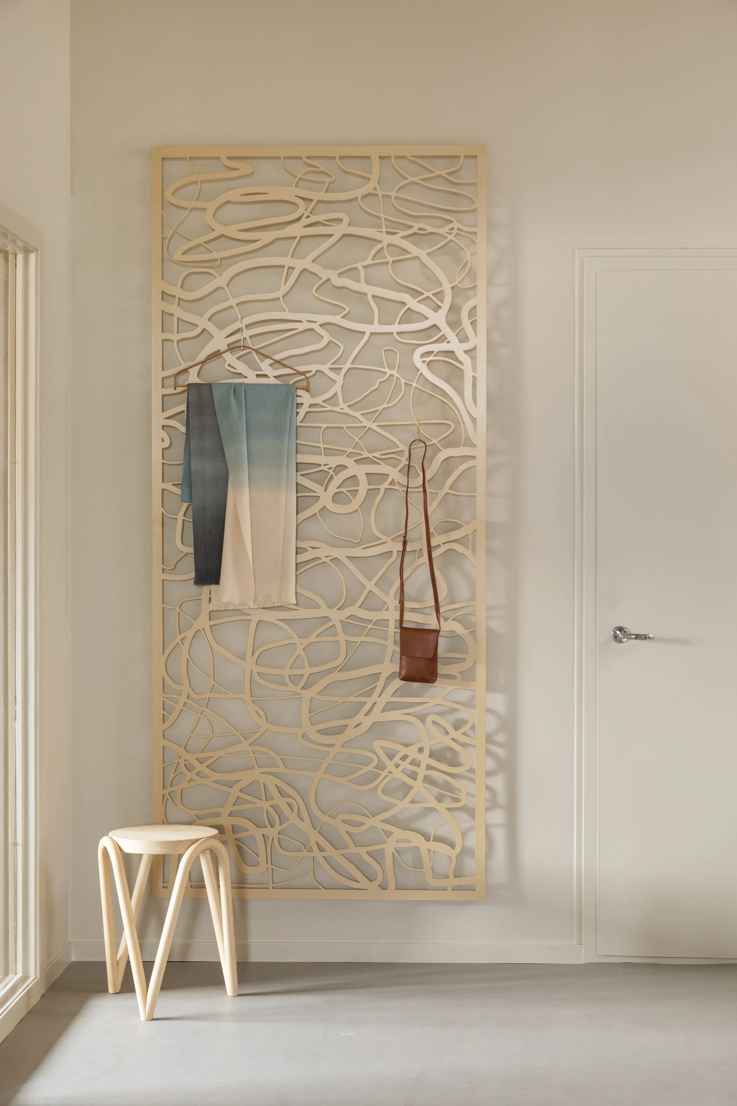 The need for more space to dry clothes and larger textiles was the starting point for this object. The idea was to make the most of a small wall area by creating a vertical solution that is both flexible and practical, while also serving as a sculpture. The numerous gaps in the design create an almost infinite number of hanging points for hangers or S-hooks, which can be easily adjusted to suit changing needs. In a social setting, it offers extra space for hanging jackets. In daily life, children can use the lower sections to hang their backpack, and clothes -whether wet or dry.